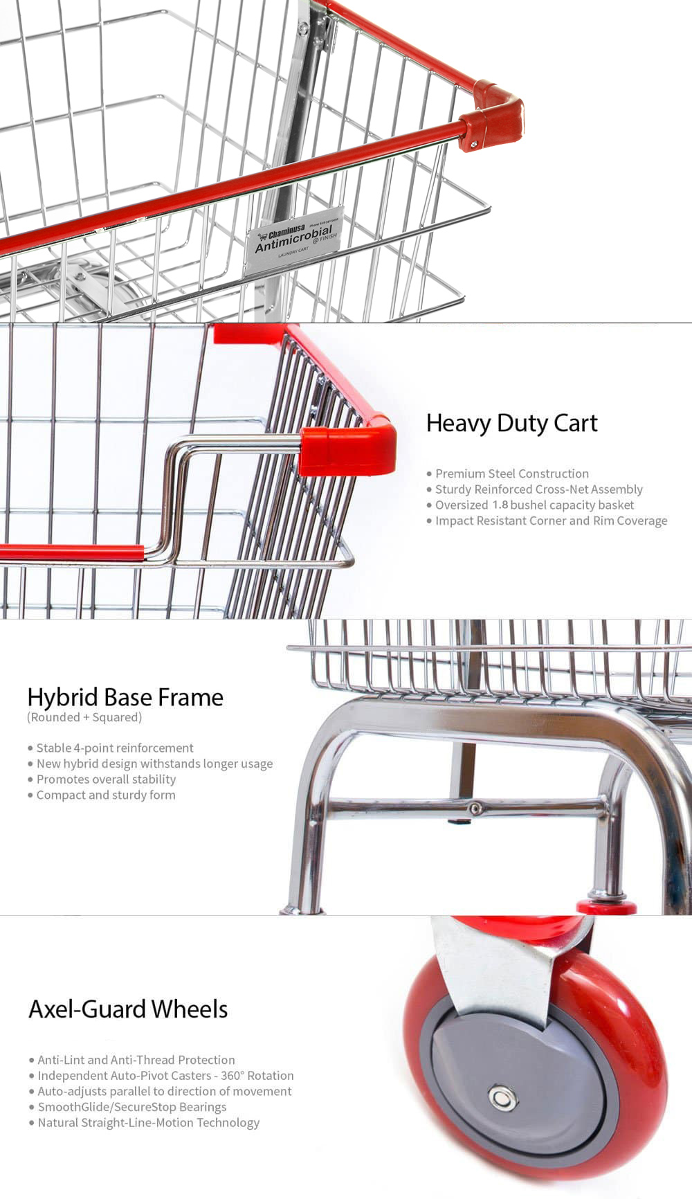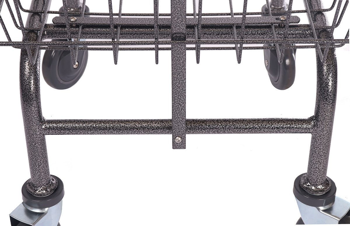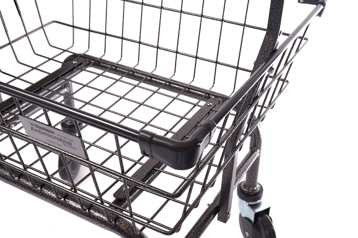 This Household & Commercial cart provides1.8-bushel capacity and is built to last for years. This product is ideal for coin-laundry, healthcare, hospitality, laundry, janitorial supply, material handling, car wash sectors and apparel factories. The cart comes standard with Axel Guard Casters (patent pending), one of the most efficient anti-lint and anti-thread wheels in the market. It is equipped with an oversized powder coating basket